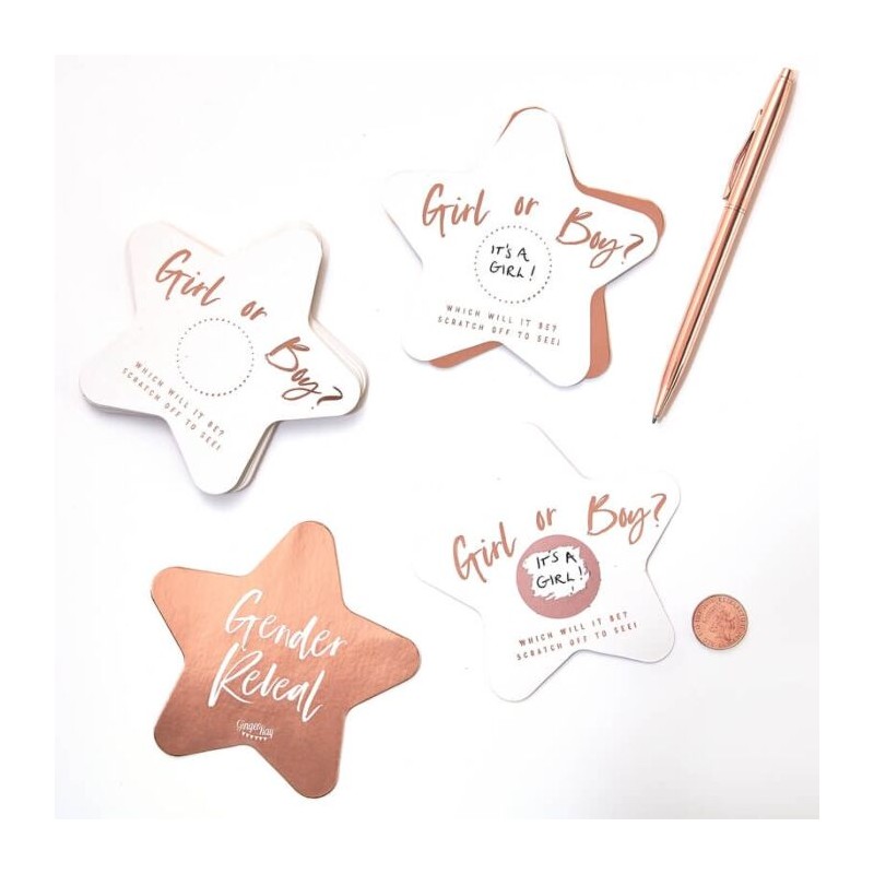 Placez ces magnifiques cartes à gratter Gender Reveal sur la table pour vos amis et votre famille afin que tous vos proches puissent partager votre journée spéciale avec vous! Parfait pour une révélation de genre ou une fête de naissance. Partagez les détails du sexe de votre bébé avec ces cartes à gratter uniques Gender Reveal.